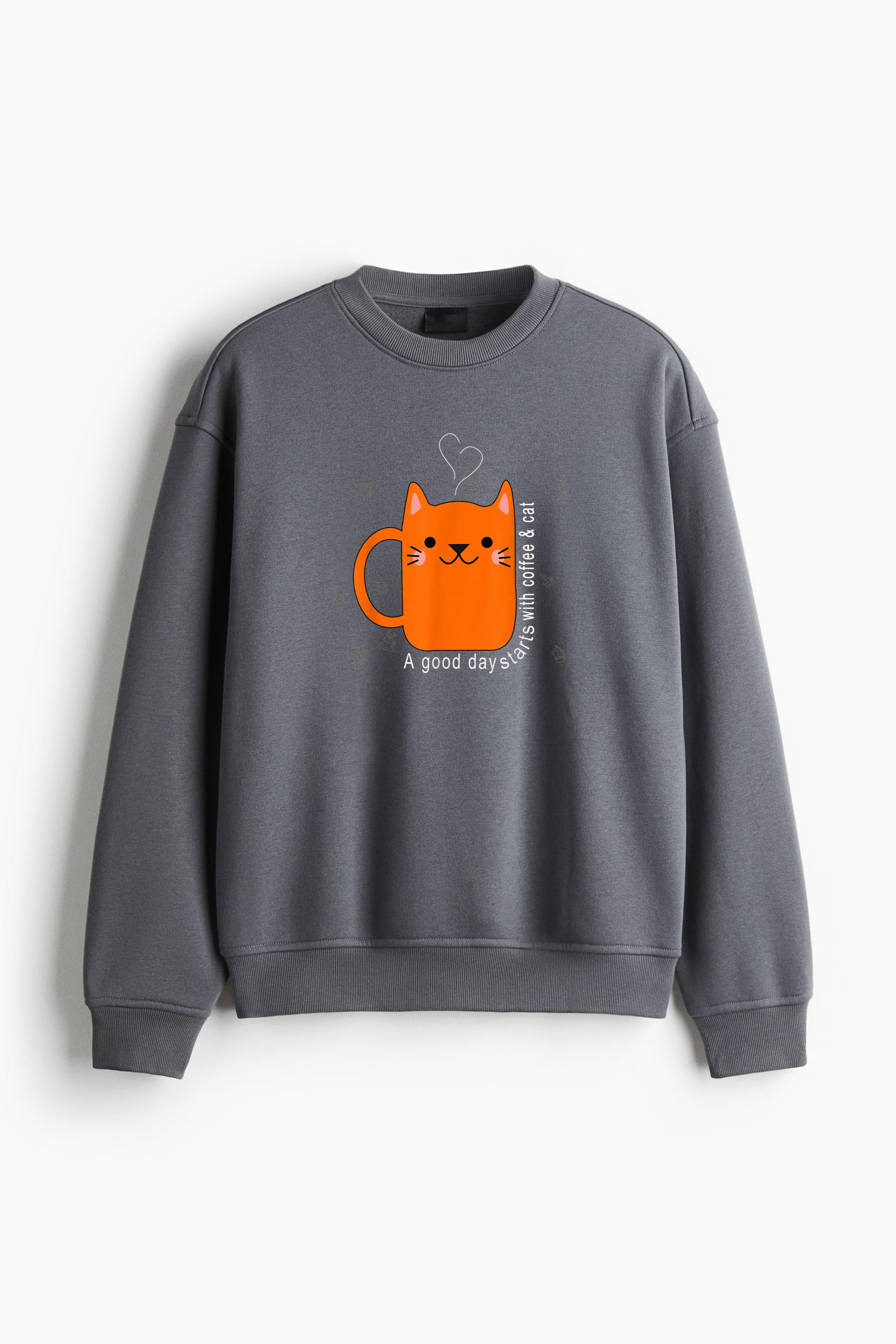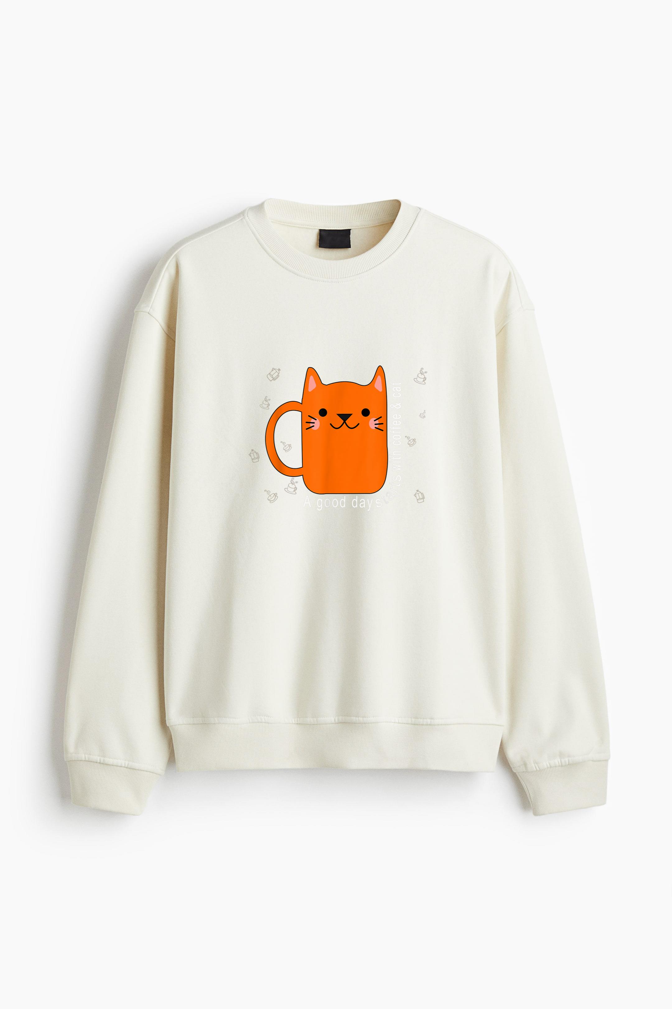 Orange Cat Coffee Mug Regular Fit Printed Sweatshirt Regular Fit Printed Sweatshirt – Soft Cotton Fleece Pullover with Graphic Design