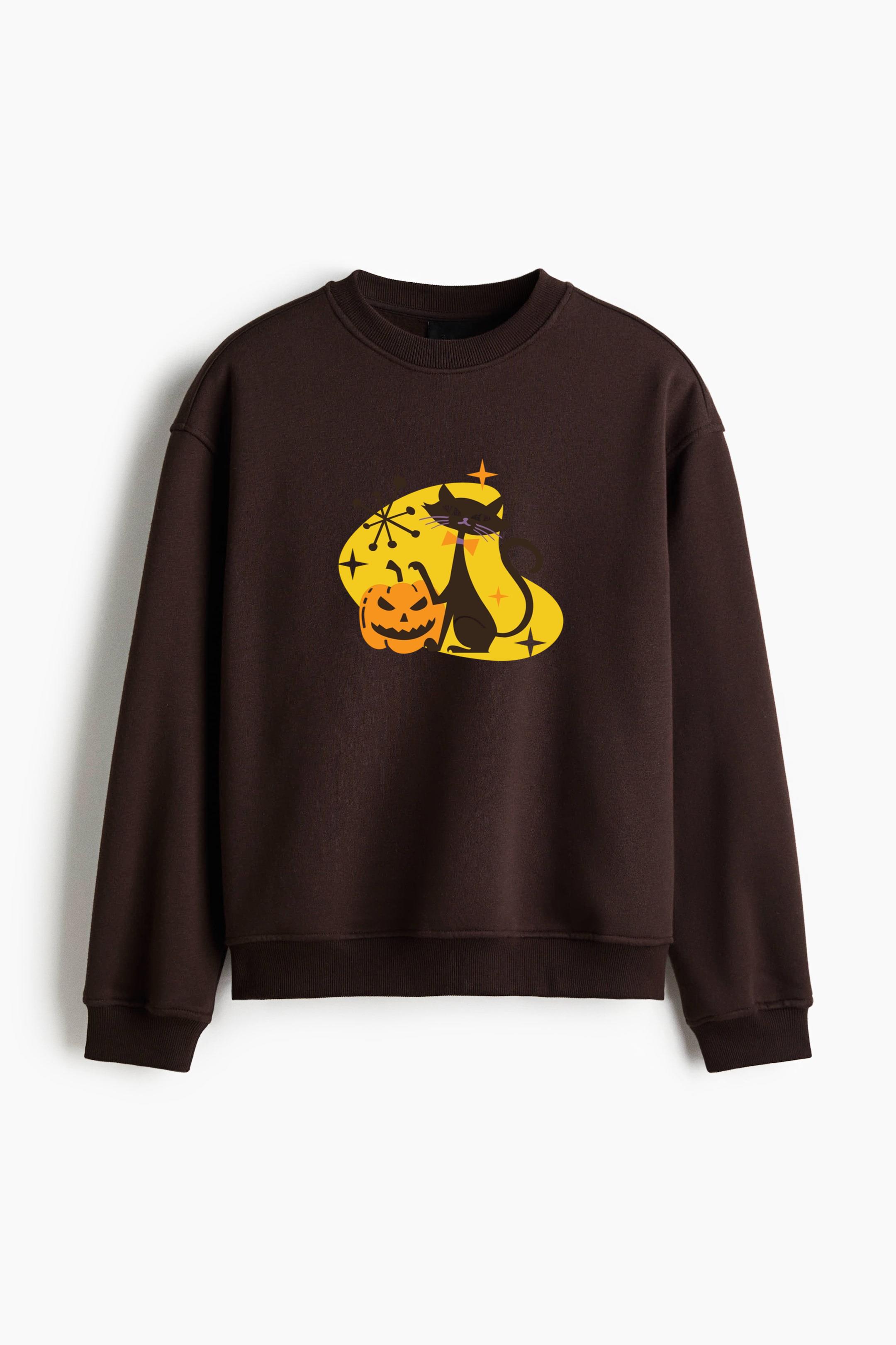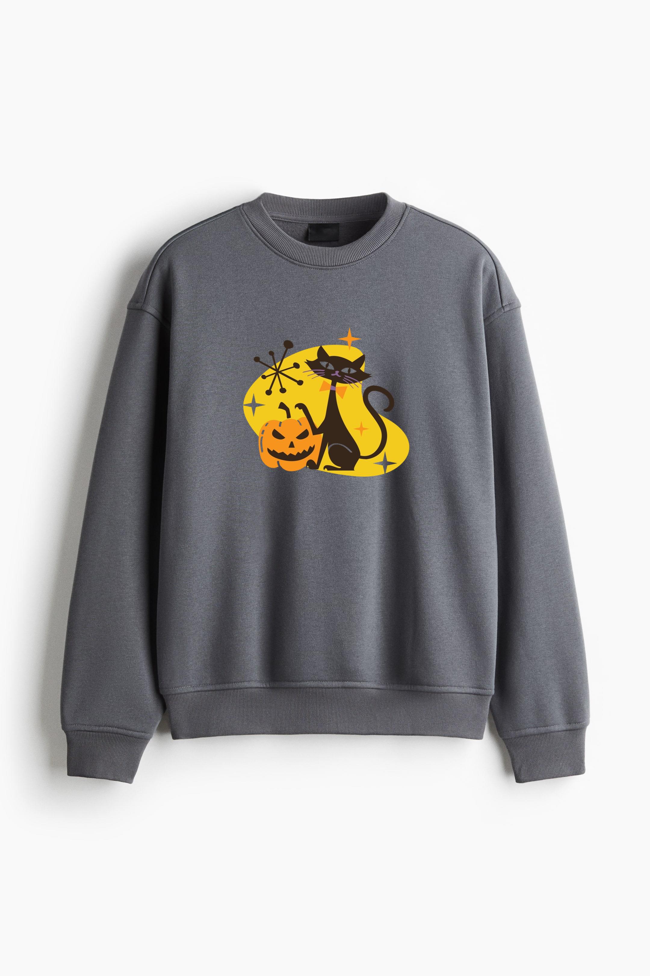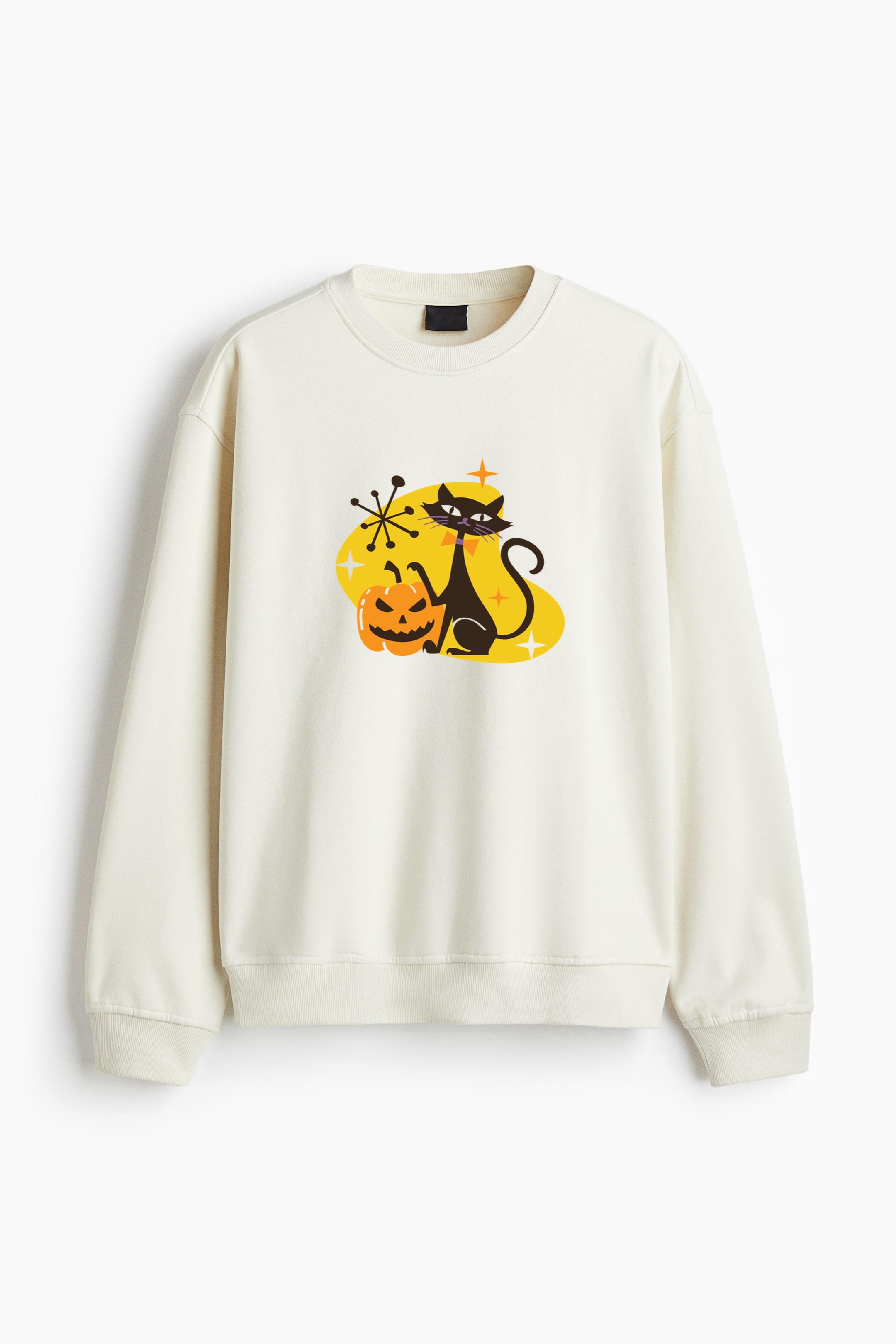 Spooky Pumpkin Black Cat Regular Fit Printed Sweatshirt Regular Fit Printed Sweatshirt – Soft Cotton Fleece Pullover with Graphic Design